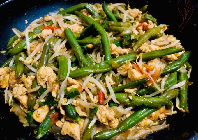 - Fisolen sind am blanchieren und die Gemüsebrühe beiseite gestellt • Pfanne -> Fleisch und Jungzwiebeln (von Zwiebeln lässt du etwas auf der Seite) schön scharf anbraten (Olivenöl) danach senkst du die Hitze und fügst die Sojabohnen/ Sprösslinge & Sojasauce hinzu • Fisolen herausgeben und hinzugeben.. • Brühe aufgießen.. jetzt würzt du es je nach Bedarf.. mit Salz, Pfeffer und Chilli.