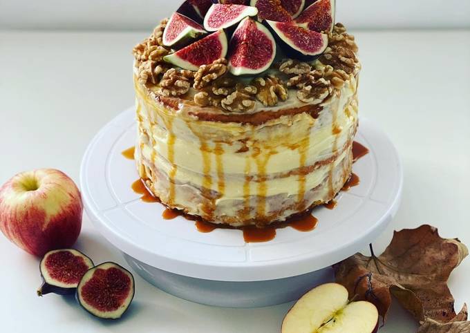 - Einen der 3 Böden auf eine Kuchenplatte legen und mit der Creme bestreichen. Den nächsten Boden darauf legen und abwechselnd mit der Creme bestreichen. Am Ende den letzten Boden darauf geben und das Törtchen mit der weißen Creme rundum leicht bestreichen. Die Karamellsoße auf das Törtchen geben und die Feigen und die Walnüsse darauf dekorieren..